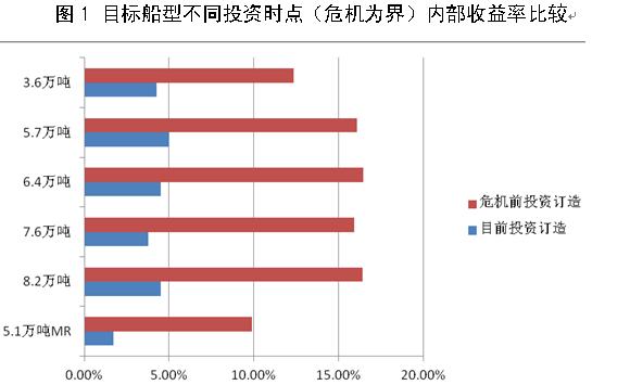 就中遠(yuǎn)期的三大主流船型市場而言,我們一方面要看未來特定市場運(yùn)力供求關(guān)系;另一方面,更要看當(dāng)期投資成本大小和由此帶來的船隊(duì)競爭力問題。上述分析已經(jīng)表明,未來較長時期內(nèi)全球各型船舶的船隊(duì)均存在運(yùn)力過剩壓力,航運(yùn)費(fèi)率可能會長期在低位徘徊,但是,如果航運(yùn)企業(yè)以當(dāng)前價(jià)格投資造船,仍能以較低的投資成本確保相對較高的投資回報(bào)率。理由是,一方面,以當(dāng)前成本訂造的新船肯定有很高的市場競爭力;另一方面,在某種程度上也會拉低前幾年高峰期訂造的高價(jià)船的單位平均投資成本,提升船隊(duì)綜合市場競爭力。以目標(biāo)船型不同投資時點(diǎn)(以危機(jī)爆發(fā)前后為界)內(nèi)部收益率測算比較為例,我們發(fā)現(xiàn),國際金融危機(jī)爆發(fā)后訂造的目標(biāo)船型內(nèi)部收益率均能達(dá)到15%左右的較高水平,而危機(jī)前訂造的目標(biāo)船型內(nèi)部收益率均不足5%。由此可見,當(dāng)前投資優(yōu)勢十分顯著。