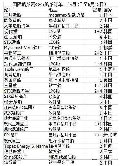 根據國際船舶網公布的5月2日至5月13日的船舶訂單來看,鉆井船和液化船高端領域的表現異常搶眼;中日韓仍然是世界上訂單最為活躍的三個國家。其中,韓國在高端造船上顯示出“誰與爭鋒”的氣勢,中國在高端領域亦有所收獲,但仍然以傳統(tǒng)造船為主,日本已經走環(huán)保路線。