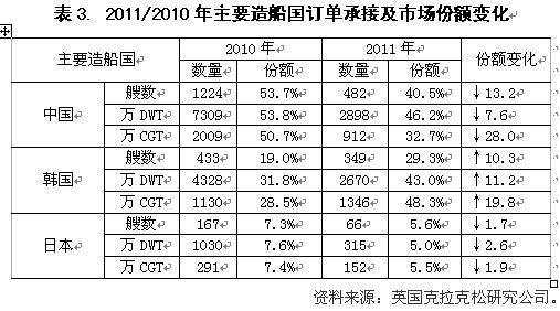 2011年世界造船仍然延續(xù)中韓兩國爭霸的局面,但是,市場需求結(jié)構(gòu)的變化導(dǎo)致兩國市場份額出現(xiàn)交叉變化。按克拉克松公司統(tǒng)計(jì),中國船廠承接訂單482艘、2898萬載重噸、912萬修正總噸,所占世界份額分別為40.5%、46.2%和32.7%,以艘數(shù)和載重噸計(jì),中國新接訂單市場份額仍占據(jù)全球第一,但份額較上一年分別下降13.2個(gè)百分點(diǎn)和7.6個(gè)百分點(diǎn),以修正總噸計(jì),中國市場份額為32.7%,較上一年下滑了28個(gè)百分點(diǎn),較韓國(48.3%)低19個(gè)百分點(diǎn),退居世界第二。