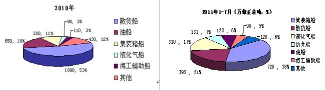 第一,2011年新船成交量再度大幅回落已成定局,細分船型市場輪動性進一步加強。按今年1-7月成交態(tài)勢測算,今年全年成交量大致在8000萬載重噸左右,較上一年下滑幅度極有可能超過40%。從細分船型市場發(fā)展而言,下半年散貨船市場總體上持續(xù)低迷;油船市場成交量可能會出現(xiàn)明顯改善;集裝箱船、液化氣船、大型海洋工程裝備產(chǎn)品以及個別特種船型在整個新造船市場中表現(xiàn)或作用將更加突出,但下半年這些細分市場行情可能較上半年有所遜色,應引起大家關注。