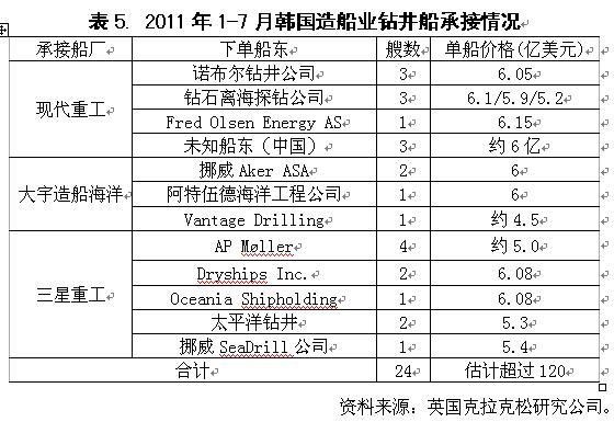 第二,韓國船企基本上壟斷大型海工裝備市場。截至到7月底,全球共有31艘鉆井船成交,除了7艘由巴西南大西洋船廠(三星重工持有該廠股份,并為其提供技術支持)承接之外,其余船舶均被韓國三大造船集團囊括,總價值金額超過120億美金,相當于220艘18萬噸級好望角型散貨船價值量(當前價)。除鉆井船外,韓國船企還承接了價格不菲的FPSO(浮式生產(chǎn)儲存與卸載系統(tǒng))、FPSO/LNG和FSO(浮式產(chǎn)品儲存與卸載系統(tǒng))訂單。與此形成鮮明對比的是,這一期間其他造船國承接到上述產(chǎn)品卻寥寥無幾。