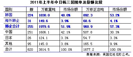 上半年韓國本土造船企業(yè)接單總量達(dá)到224艘、1830萬載重噸、892.3萬修正總噸,以噸位計分別占全球總量的48%和53.2%(如果加上海外獨(dú)資企業(yè)接單情況,上述比例將進(jìn)一步上升至51.9%和57.3%);
