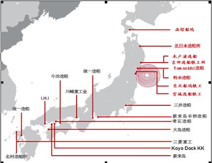 日本主要造船廠集中在南部、東南部的九州島和四國島等地區(qū),遠(yuǎn)離此次地震重災(zāi)區(qū),受相關(guān)影響也較小。此次災(zāi)害中,受災(zāi)船廠主要集中于日本東北地區(qū),主要有北日本造船、山西船廠、鈴木造船所、木戶浦造船和吉田造船鐵工所等,但這些船廠均是以生產(chǎn)小型船舶為主的小船廠,如山西船廠現(xiàn)有的手持訂單中有4艘2.4萬載重噸的散貨船,以及2艘不到1萬載重噸的汽車運(yùn)輸船。很顯然,此次海嘯并沒有給日本造船業(yè)產(chǎn)生多大實質(zhì)性的沖擊。