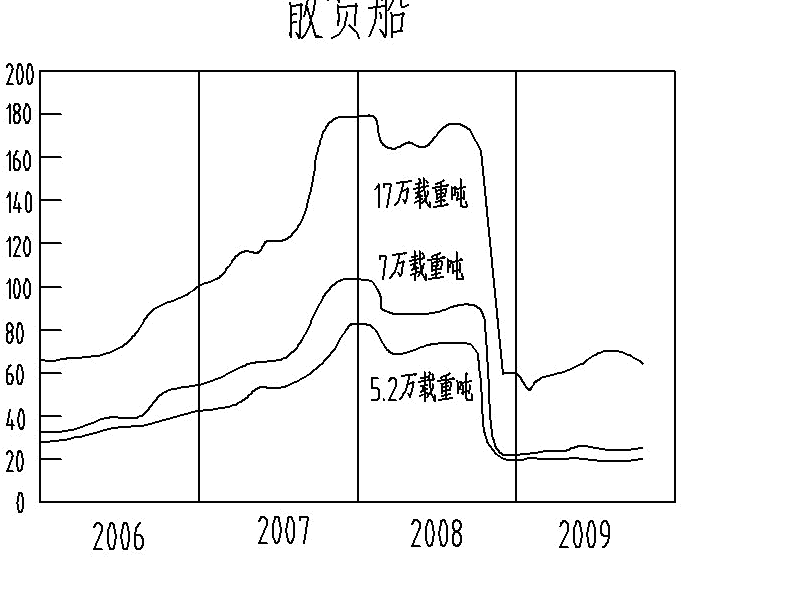 以下是2006年1月-2009年10月世界部分船型(散貨船)新船現(xiàn)售價(jià)格走勢(shì)圖
