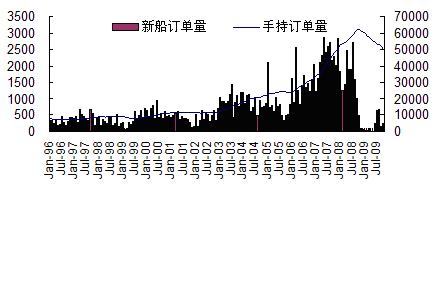據(jù)英國(guó)克拉克松公司統(tǒng)計(jì),今年1-10月全球累計(jì)成交新船261艘、2189萬(wàn)載重噸,同比下降85.3%;截止到2009年10月底,全球手持船舶訂單總量降至8422艘、5.01億載重噸,以載重噸計(jì),較去年10月底歷史最高位下降了20%。