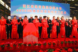 2012年2月24日上午10時28分,浙江省海運集團有限公司4.9萬噸散貨船首制船開工儀式在舟山五洲船舶修造有限公司隆重舉行。中國船級社副總裁兼上海分社總經(jīng)理莫鑒輝和省、市海事局、浙江省海運集團、上海佳豪船舶工程設計股份有限公司以及有關(guān)單位領(lǐng)導出席了開工儀式。