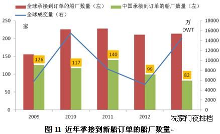但中小型造船企業(yè)接單仍存在較大困難。盡管2013年全球新船成交量出現(xiàn)近2倍的增長,但全球承接到新船訂單的船廠數(shù)量卻與2012年基本持平。而中國船廠訂單承接總量增長了200%以上,但承接到訂單的船廠數(shù)量卻從2012年的99家減少到2013年的82家。這說明,盡管船舶市場(chǎng)出現(xiàn)大幅反彈,但受益者主要是大型造船企業(yè),中小船廠由于競爭力較弱,訂單承接依然困難。
