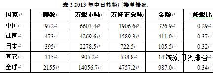2013年,中國船廠接單總量依然保持全球第一,接單金額與韓國存在差距。以艘、載重噸和修正總噸計(jì)算,中國船廠的市場(chǎng)份額分別為45.1%、47.0%和40.1%,分別高于韓國船廠23.2、16.6和6.7個(gè)百分點(diǎn);但按照接單金額計(jì)算,中國船廠的市場(chǎng)份額僅為33.1%,低于韓國船廠41.6%的市場(chǎng)份額,修載比也遠(yuǎn)低于韓國船廠。這反映了中國船廠在高價(jià)值船舶承接上仍處于相對(duì)弱勢(shì)。