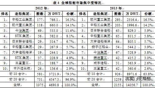 2013年,全球造船市場(chǎng)接單集中度保持高位,前10家造船集團(tuán)承接量占比為63.8%,前20家合計(jì)占比為78.6%,與2012年相比有所下滑,主要原因是成交量的大幅反彈為不少前期接單困難的大中型船廠帶來訂單。