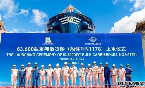 6月30日,舟山中遠(yuǎn)海運(yùn)重工為Alpha Bulkers公司建造的第2艘63600噸散貨船N1178項(xiàng)目在公司2號(hào)船臺(tái)舉行上水儀式。